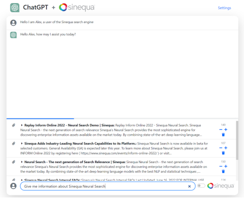 À titre d’exemple, les chercheurs et les ingénieurs qui posent des questions complexes et attendent des réponses peuvent extraire des passages d’articles pertinents en utilisant la fonction de recherche neuronale de Sinequa. Pour ensuite compléter le résultat avec l’aide de ChatGPT afin de créer un résumé ciblé de leur recherche et ainsi réaliser une présentation rapide, pratique et complète de leurs informations.