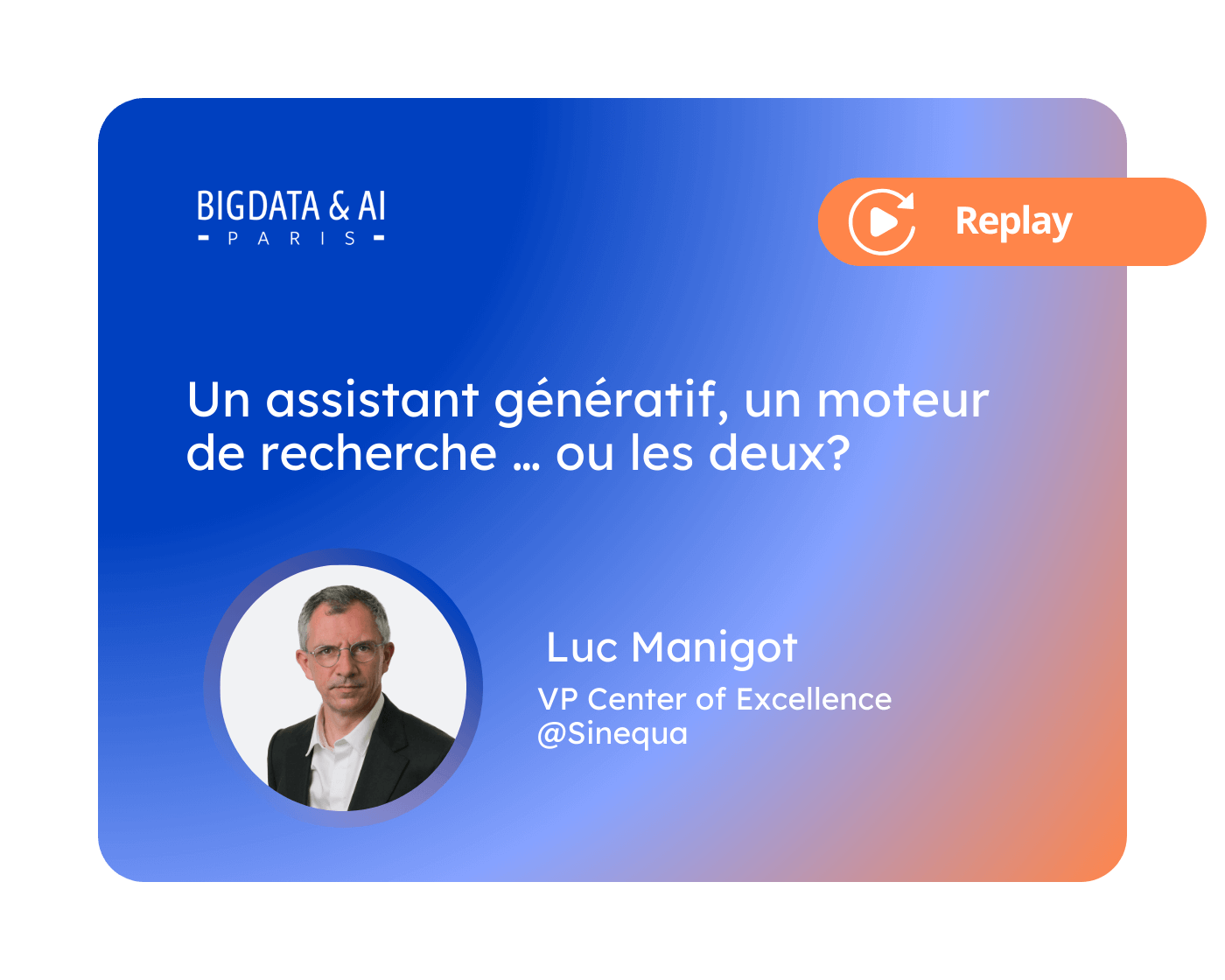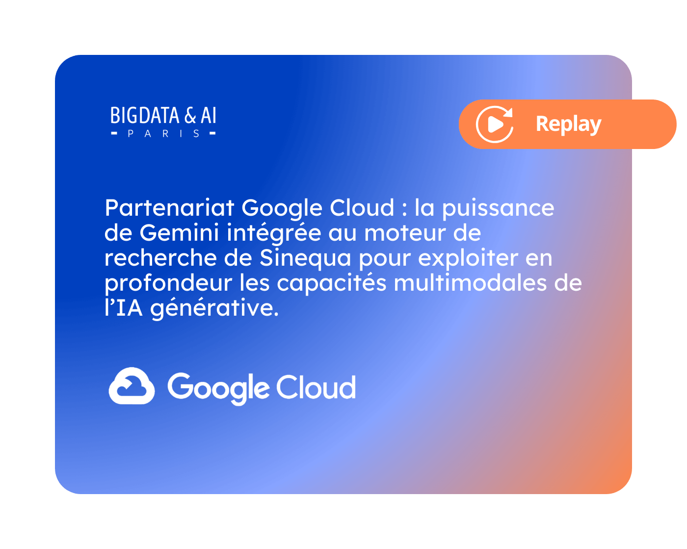Revivez les moments forts de Big Data & AI Paris 2024 grâce à notre sélection de vidéos replay exclusifs. Durant deux jours, les experts de Sinequa et nos partenaires ont partagé des insights sur l’IA générative, la recherche d’entreprise, et les dernières avancées technologiques. Explorez chaque intervention à travers nos replays et plongez dans un monde d’innovation.