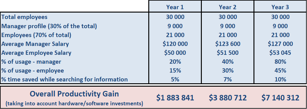 Having said that, some dollars savings can be estimated through productivity gains. The main assumptions include the number of employees, the average salary, and the percentage of working time saved thanks to a simple information finder. A summary of an ROI that was calculated for a company comprising of 30,000 employees can be seen below.