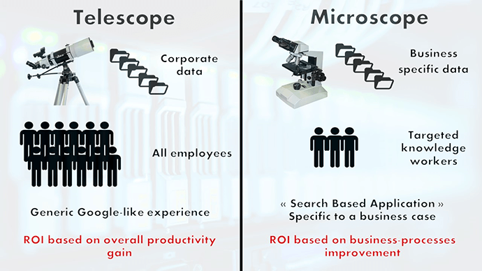 Such use of enterprise search does not bring a high degree of business specificity. This is typically a Google-like experience with a simplified interface that is used indifferently by marketing, sales, engineering, or accounting people – any employee. Working across business units to address multiple audiences (a horizontal approach) – its value can be uncovered by helping a large number of employees to find information; the ROI (Return on Investment) is based on an overall improvement of the company’s productivity.